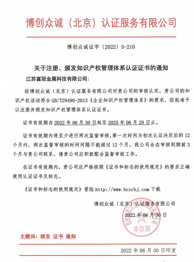 知識(shí)產(chǎn)權(quán)管理體系認(rèn)證證書(shū)